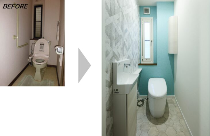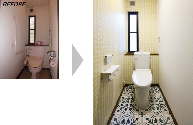 工事内容:1階2階の全面リフォーム 壁断熱・内窓取付・床暖房 外壁塗装・バルコニー防水 お子さまのご入学を機に、築25年の戸建てを大規模にリフォームしました。 1階・2階のトイレ 壁のクロス・床のクッションフロアーの組み合わせで、それぞれ違った印象に。 面ごとに柄を変え、お客さまのイメージをカタチにしました。 タンクレストイレは空間をすっきり見せることができます。 節水タイプに取替えたことで、水道代の節約にも。