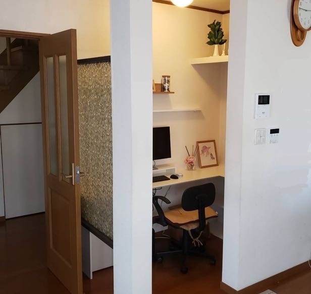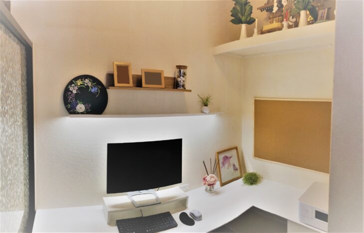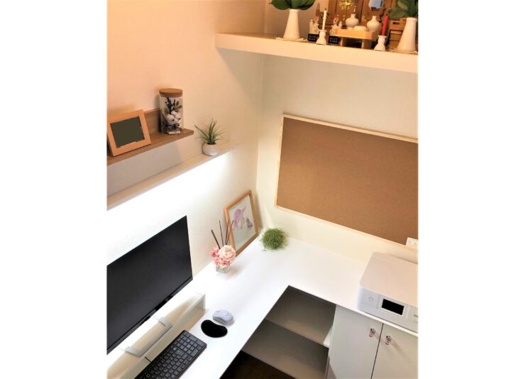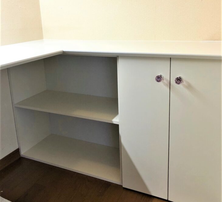 ごちゃごちゃしがちなパソコンまわりの配線もすっきり。扉の取っ手はピンククリスタルでかわいらしく。