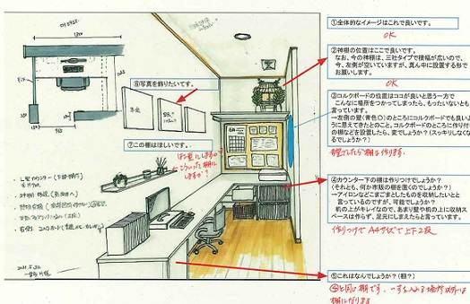 スケッチで、お客さまと完成後のイメージをすり合わせます。新型コロナウイルスの感染防止のため、打ち合わせもリモートで。