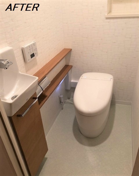 施工内容:トイレ取替 壁、床 内装工事 施工日数:1日 タンク有り⇒タンク無しのトイレへの取替。 タンク分の面積がないので空間がすっきり。 手洗いは別で設置するので、楽な姿勢で手洗いもできます。 奥にタンクがあったときは、水が飛び散りお掃除が大変だったとのこと。掃除もしやすくなって大変喜んでいただけました。 TOTOのネオレストは、使うたびに「きれい除菌水」が除菌をおこなうなど、汚れが付きにくい・掃除がしやすい工夫がたくさん。 トイレを取り換えるだけで、節水・節電・掃除時間の時短になります。