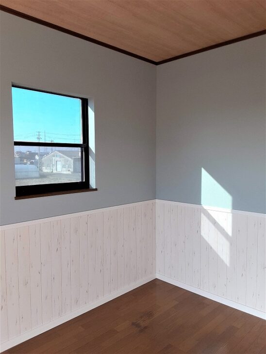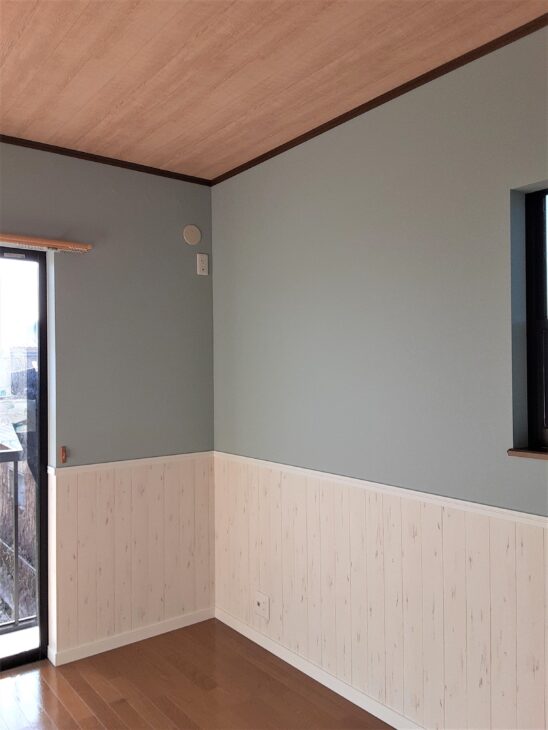 施工内容:クロス張替え 施工日数:2日 腰壁があるようにしたかったため、腰下は木目調のクロスを。廻り縁で境界線を作ることにより、腰壁風クロスの完成です。 クロス上下の、巾木と廻り縁を同じ種類にすることによってスッキリした印象に。 「可愛いーっ♪」と、お嬢さまたちにもご好評。お気に入りの空間になりました。
