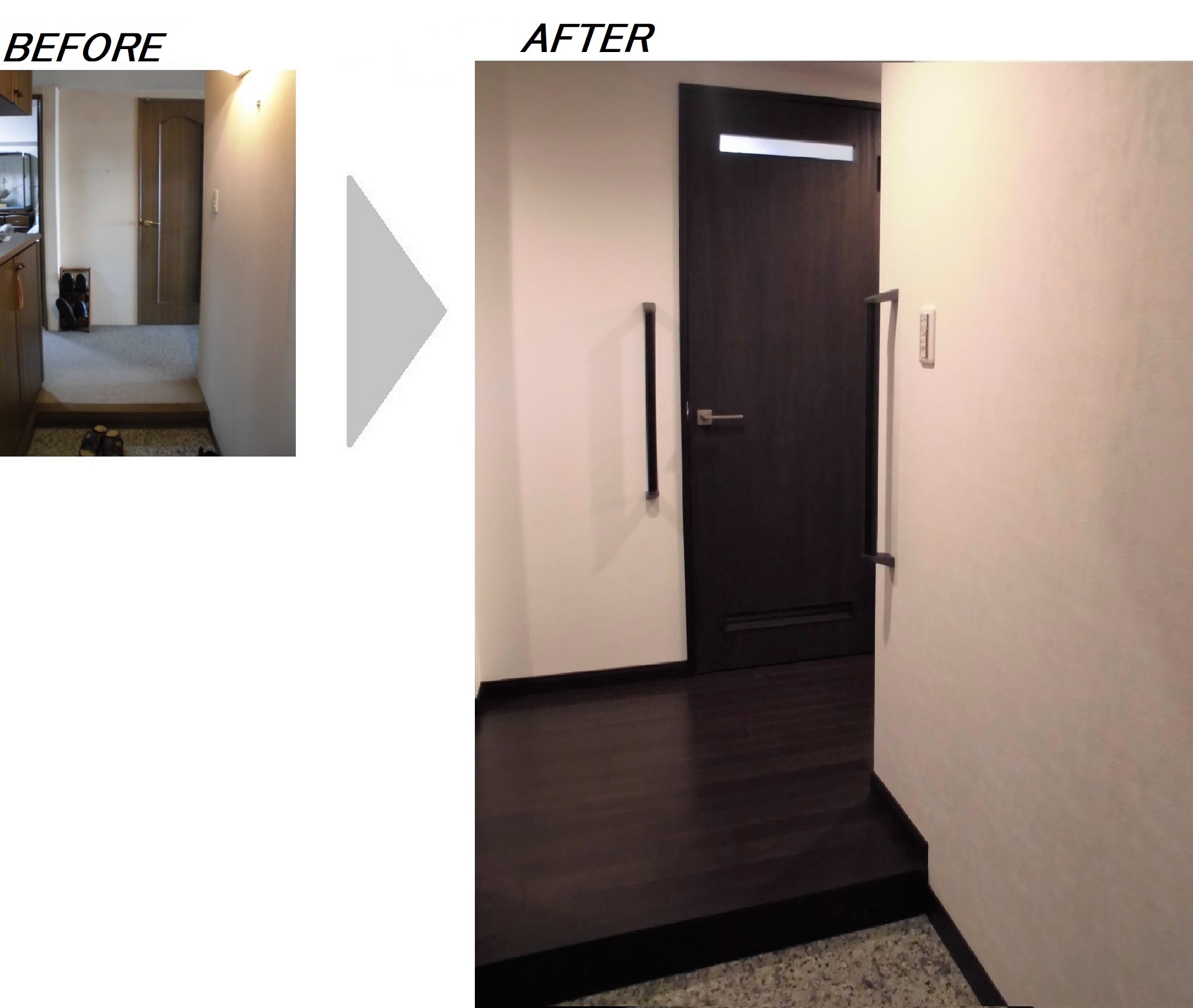 マンション(築31年) 施工日数 約2か月 施工内容 水周り設備取替 床張り替え 壁紙クロス張り替え 給排水やり替え 造作収納 ほか多数 築年数の経過したマンションをまるごとリフォーム。 隠れている配管の部分も、末永く安心して暮らしていただけるよう、すべて新しく入れ替えました。 ご高齢のご両親と同居されているお施主様。ドアにはすべて手すりを設置し、将来の介護に備えました。
