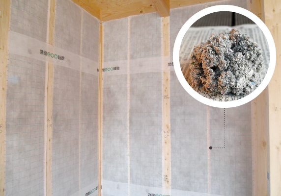 内断熱材は、米国シェアNo.1の断熱材「セルロースファイバー」。天然木質繊維が持つ高い断熱性能は、壁や家の中の結露を低減するなど、防露・調湿性能にも優れています。また、高い防音効果や1000℃のバーナーでも火がつかない高い防火性能を発揮します。