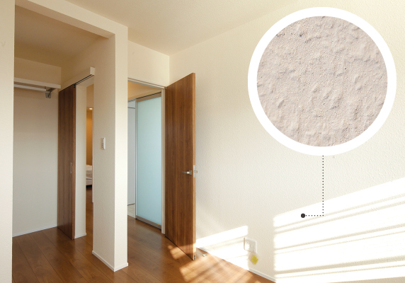 ホタテ貝の殻はポーラス(孔)が大きく、臭いの分子を吸着。高い消臭効果を長く持続します。ホルムアルデビドなどの有害物質を吸着するほか、調湿効果もある、まさに「呼吸する壁」。室内を常に快適な状態に保ちます。